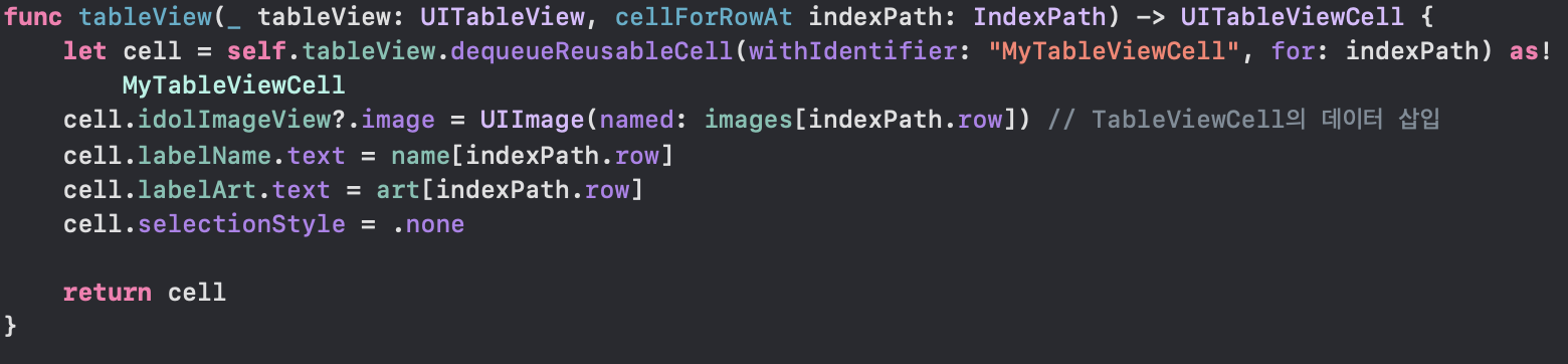 - cellForRowAt : TableViewCell의 객체(인스턴스, 뷰)를 return, 메모리 때문에 deque를 이용하여 cell을 재사용